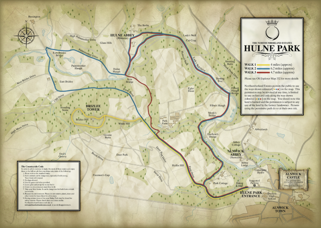 There are three varied routes - Walk 1 (4 miles), Walk 2 (6.2 miles), Walk 3 (4.7 miles)., as per the map image. Expect to find parkland, Alnwick Abbey, a Priory and farmland. There are some great viewing points for stopping for a picnic or a hot flask of tea.