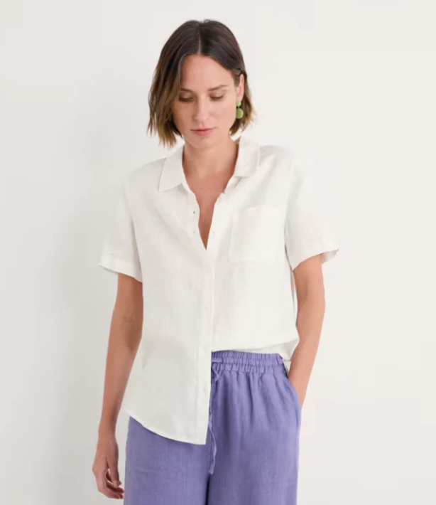 It has a loose, relaxed fit and is slightly longer in length. As it's made from pure linen, it's naturally cool, airy and breathable making it a great choice for summer style.