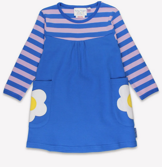 Long Sleeve Black & White Breton Stripe Hooded Dress - with Floral Motif