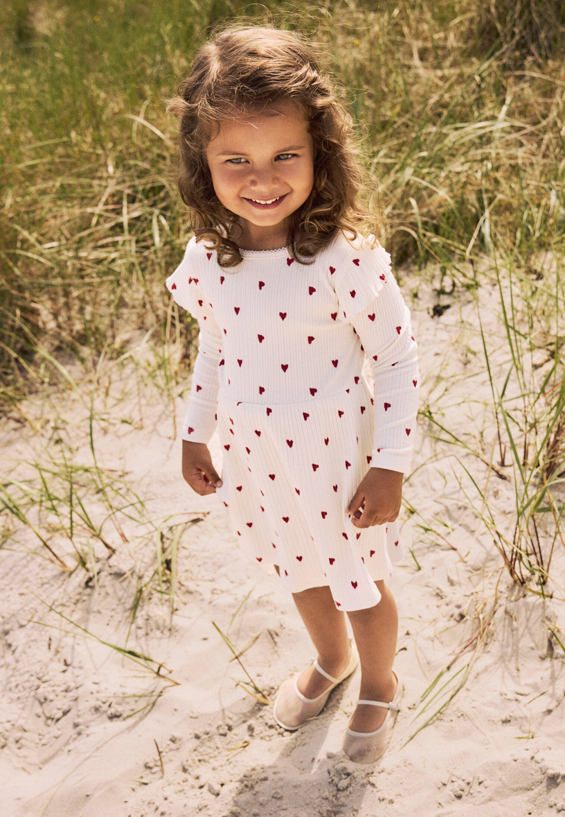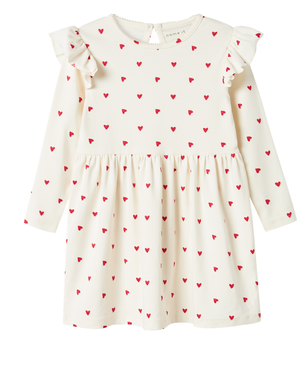 This Heart Motif Dress from Name It is a perfect addition to your little ones wardrobe. With a frill shoulder style, cute heart print over the whole dress, in a great cotton material, designed to be worn again and again. They're going to love this dress!