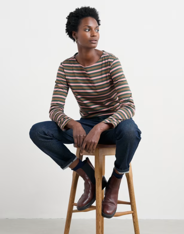 Effortlessly stylish, Seasalt's Sailor Shirts are made from soft and breathable organic cotton jersey, with long sleeves and an elegant boat neck. The Breton-inspired stripes are yarn-dyed for crisp colour and longevity – this colour and print is Duet Mini Cornish Coppice.