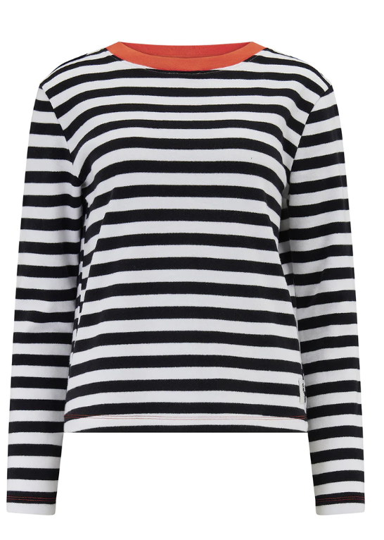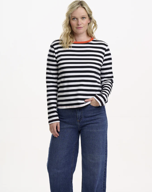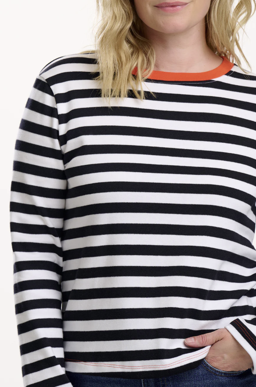 Elevate your everyday style with the Sugarhill Brighton Vienna Jersey Top in White and Black Stripes. This classic long-sleeve Breton top features bold horizontal stripes on soft jersey fabric, finished with a statement contrast neckline in vibrant orange for a playful twist. The relaxed fit and crew neck make it an effortless layering piece for jeans, skirts, or under dungarees—perfect for casual days and weekend wear.